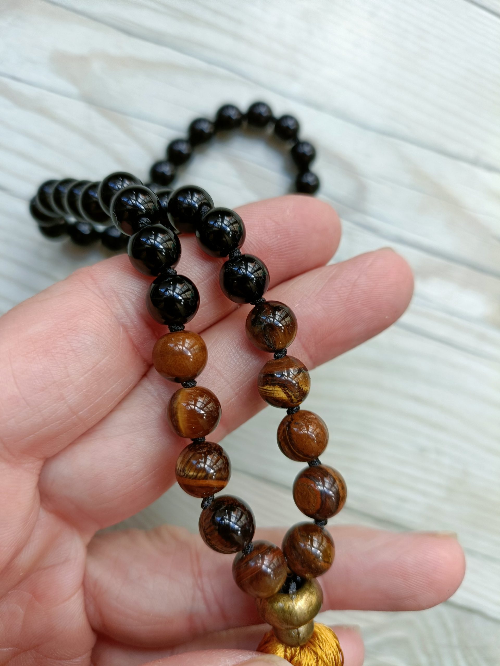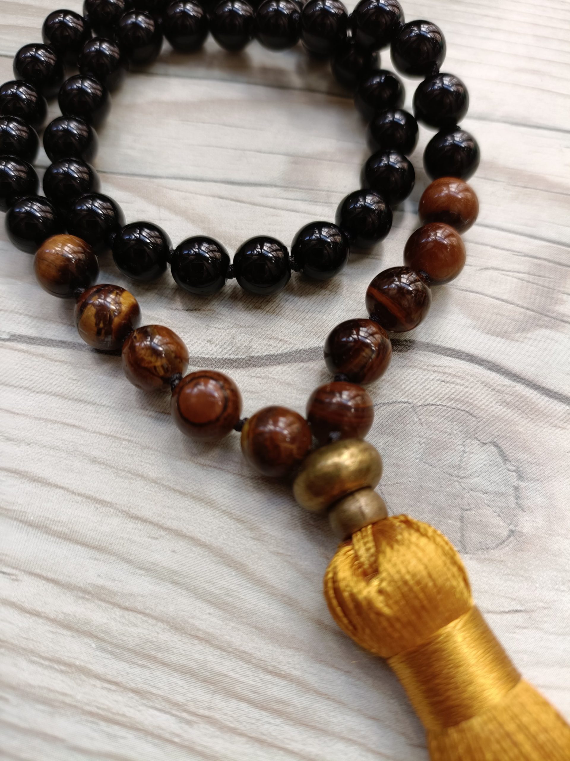Japa mala de 45 cuentas de ojo de tigre y onix de 8 mm, anudadas una a una, ofreciendo una gran resistencia y durabilidad.