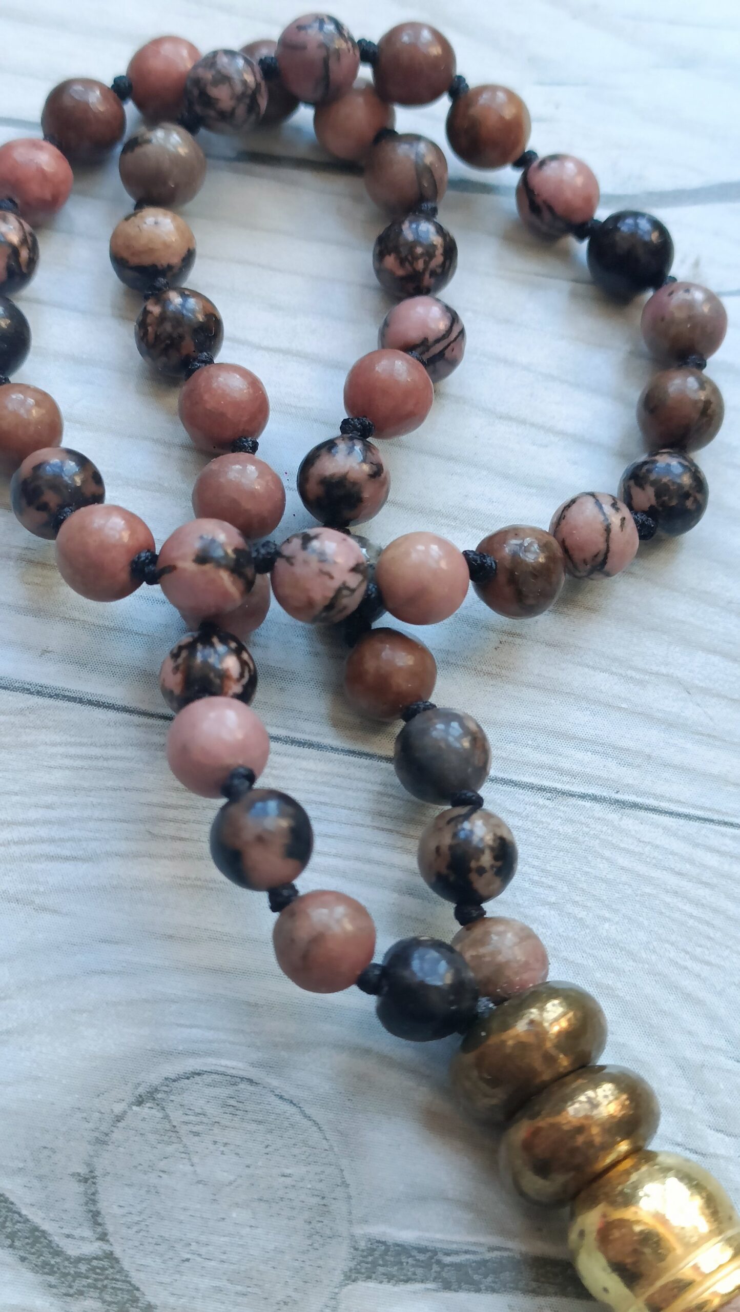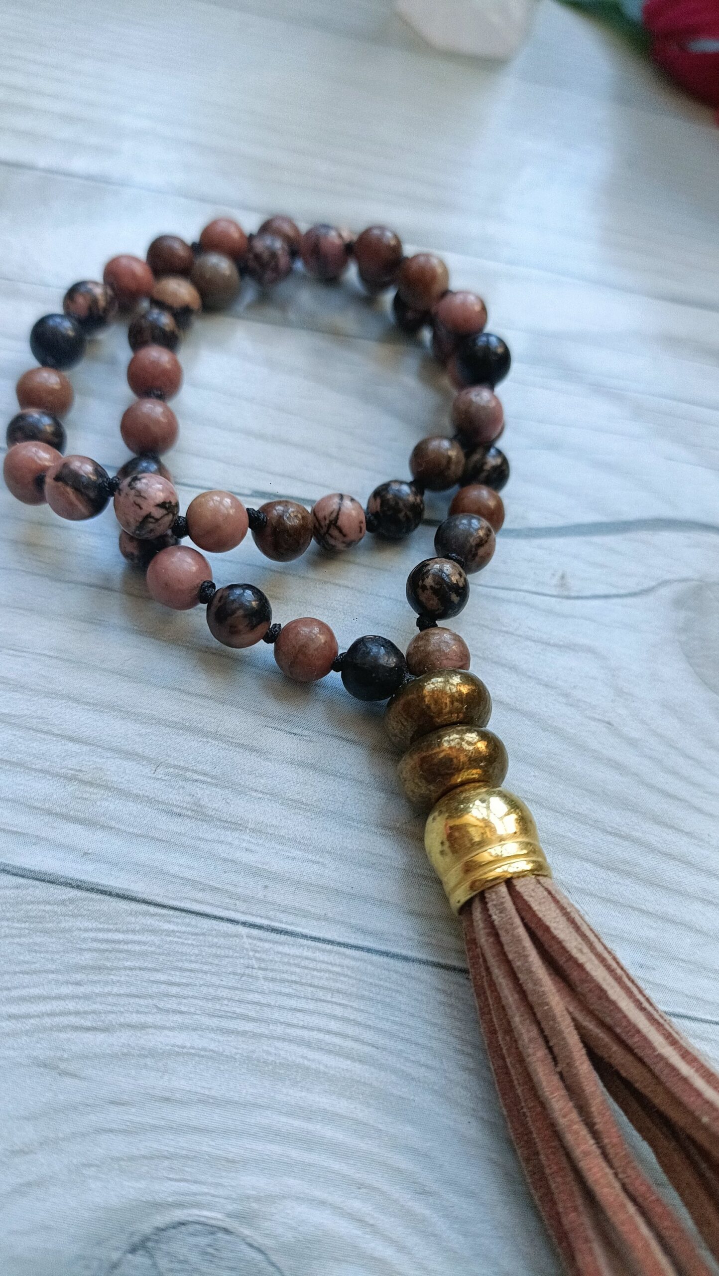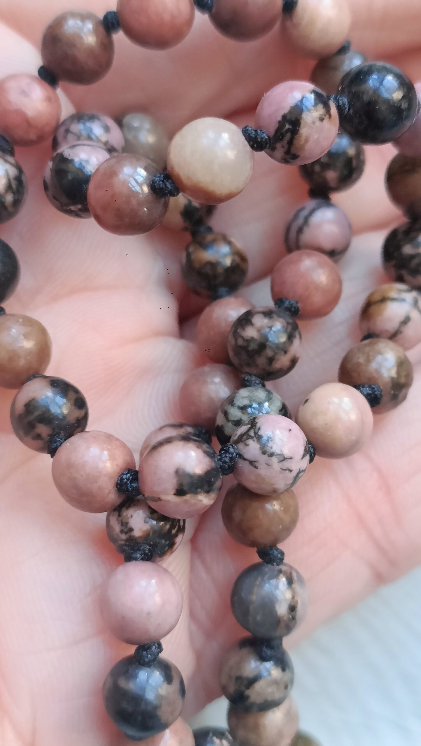 Mini Japa mala de 45 agatas de rodonita de 6 mm anudadas una a una, para mayor resistencia y manejo del recuento.