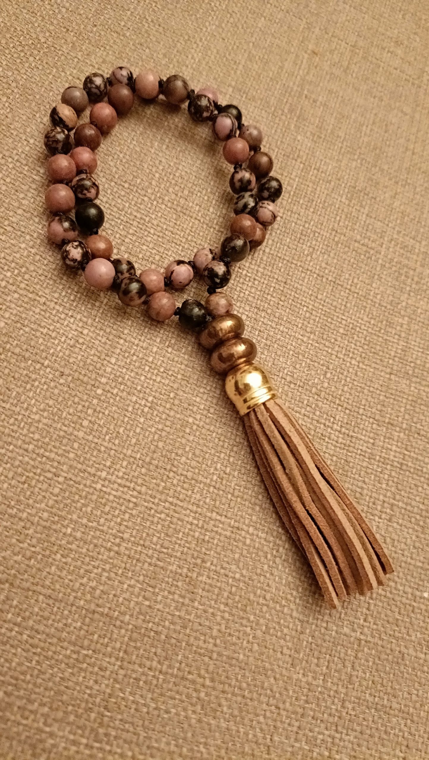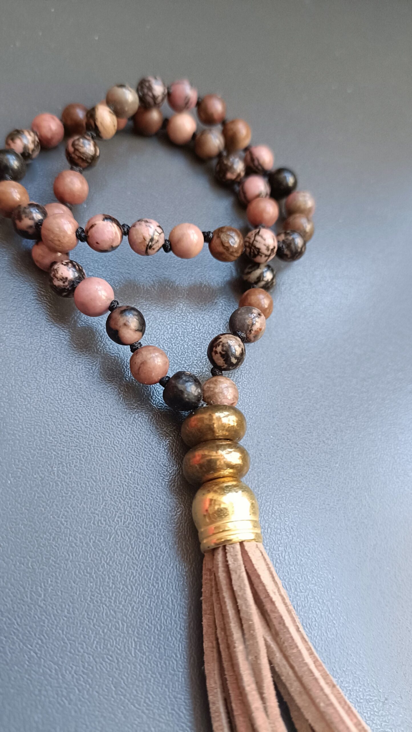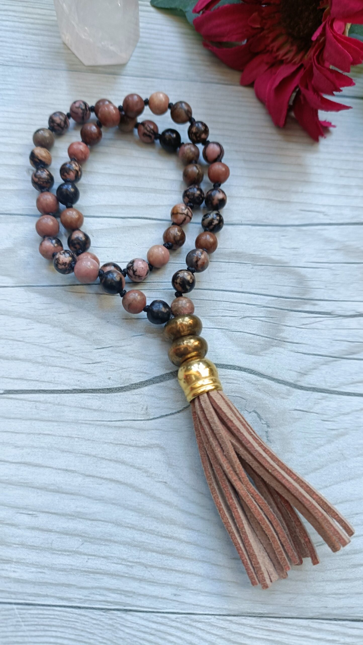 Mini Japa mala de 45 agatas de rodonita de 6 mm anudadas una a una, para mayor resistencia y manejo del recuento.