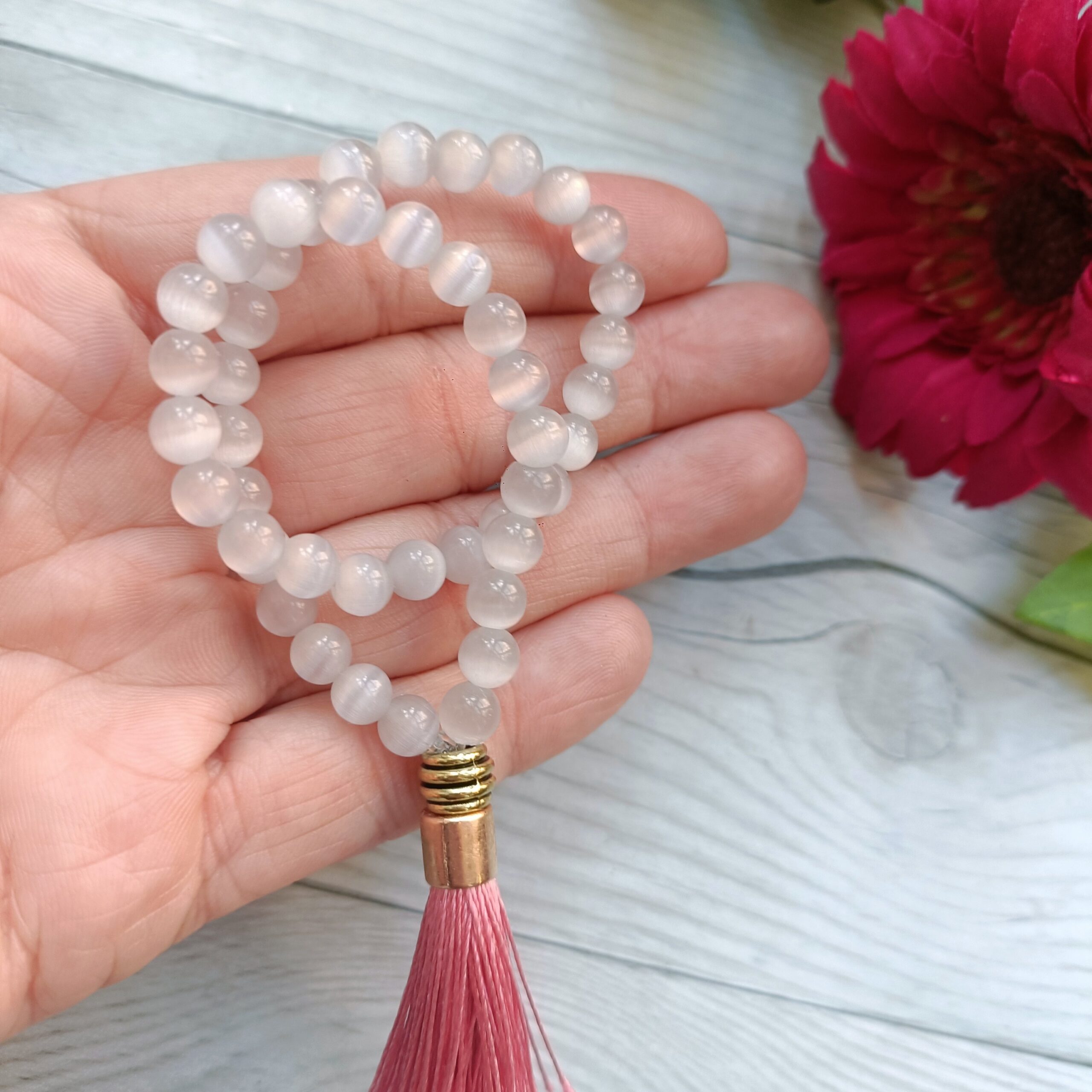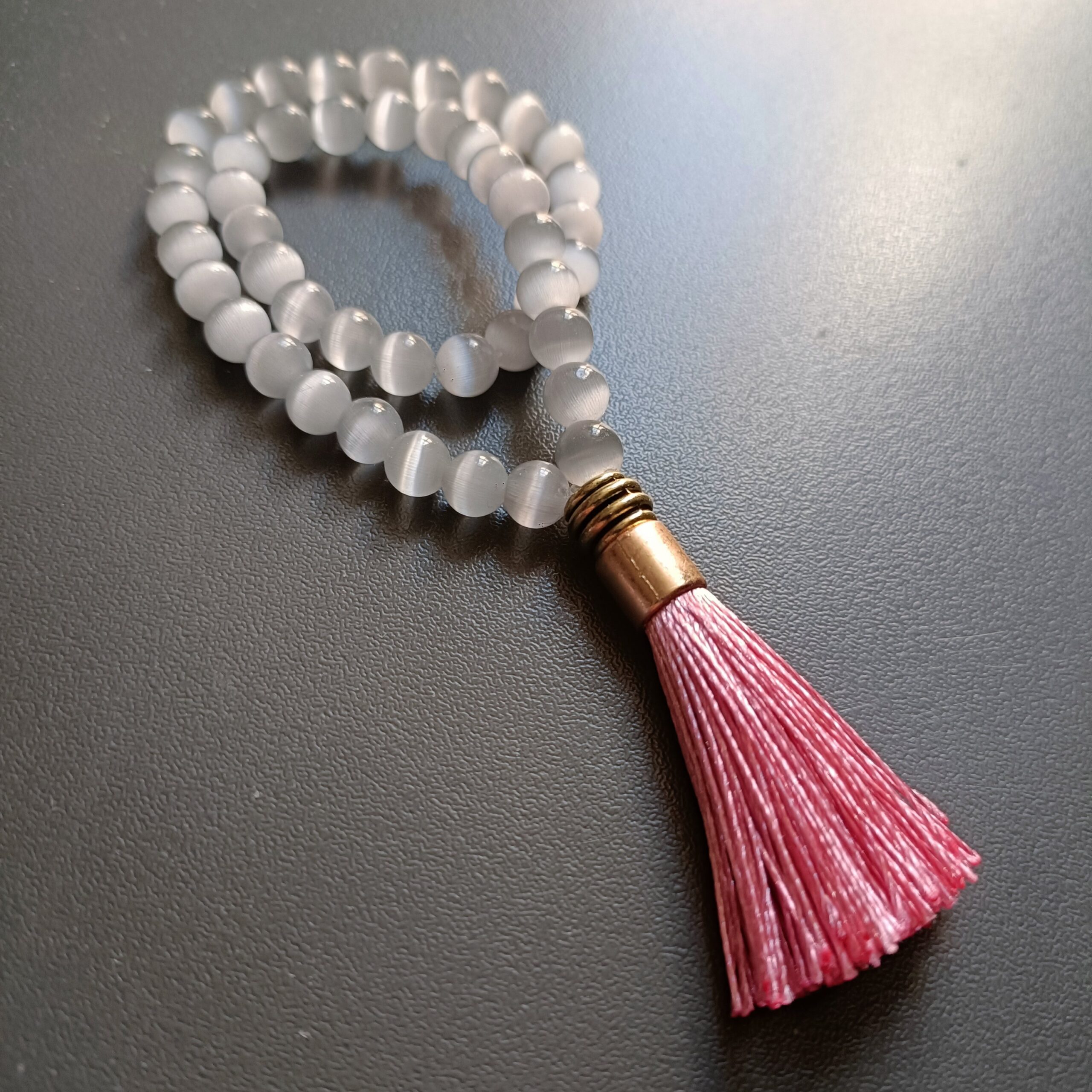 Mini Japa mala de crisoberilo blanco.
