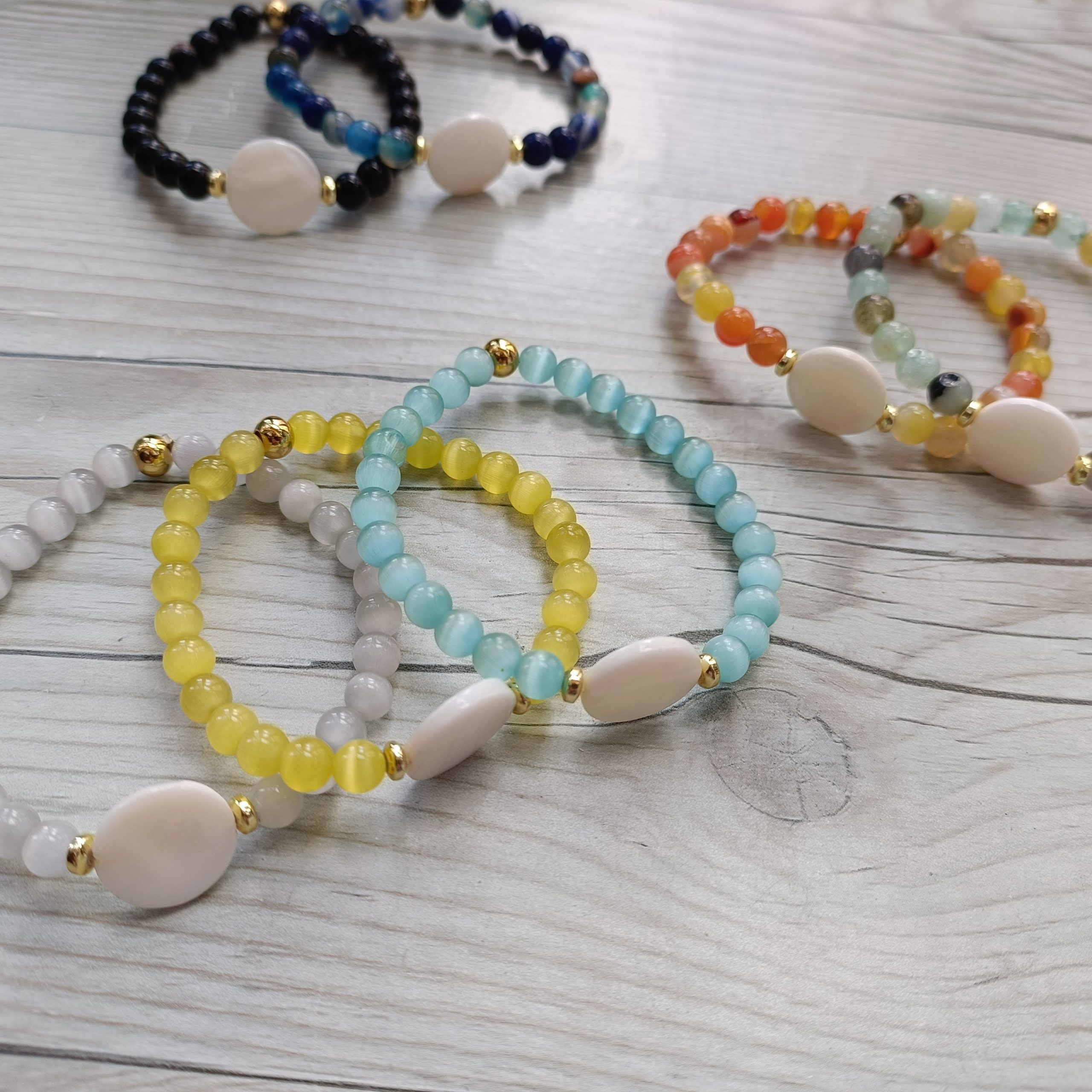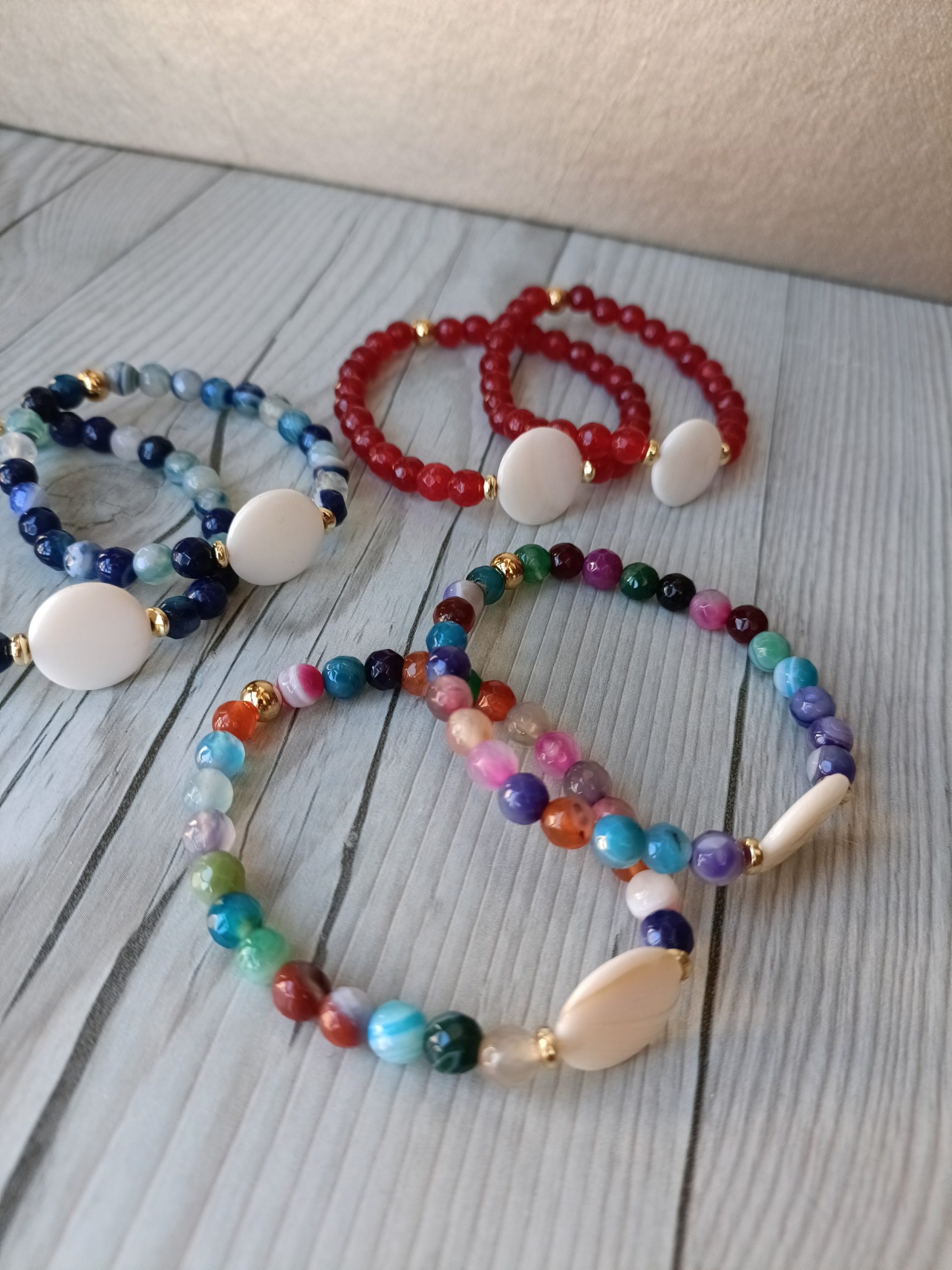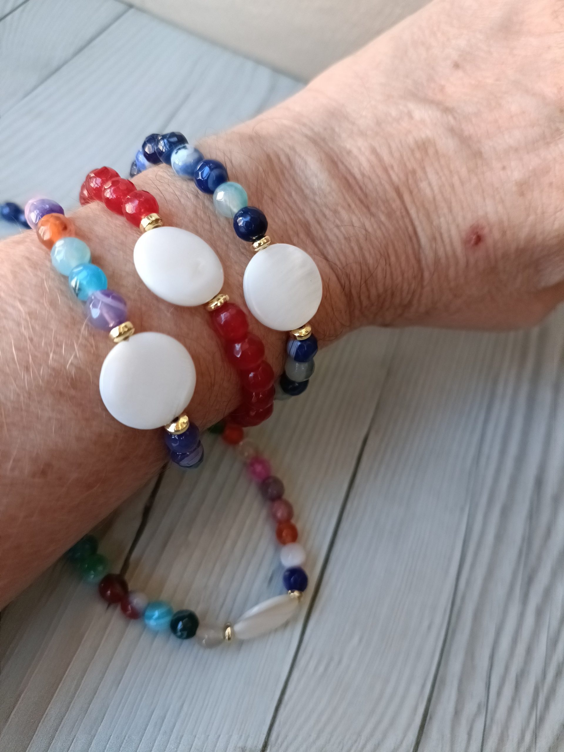 pulseras de ágatas y nácar. Con adornos dorados de hematite y acero.