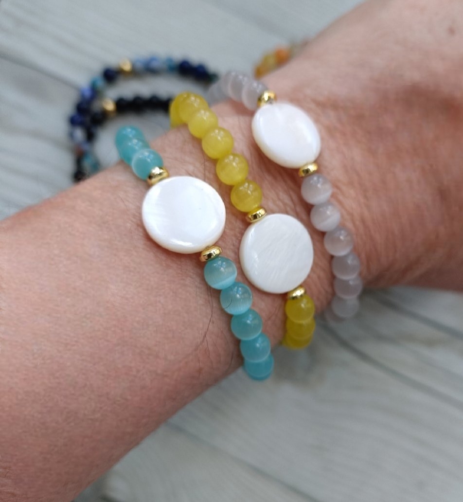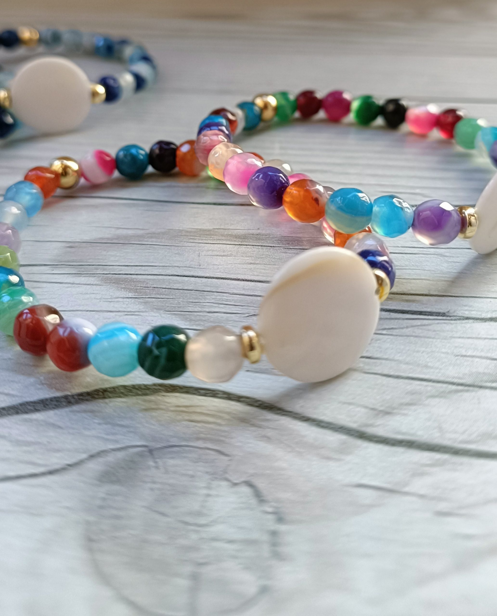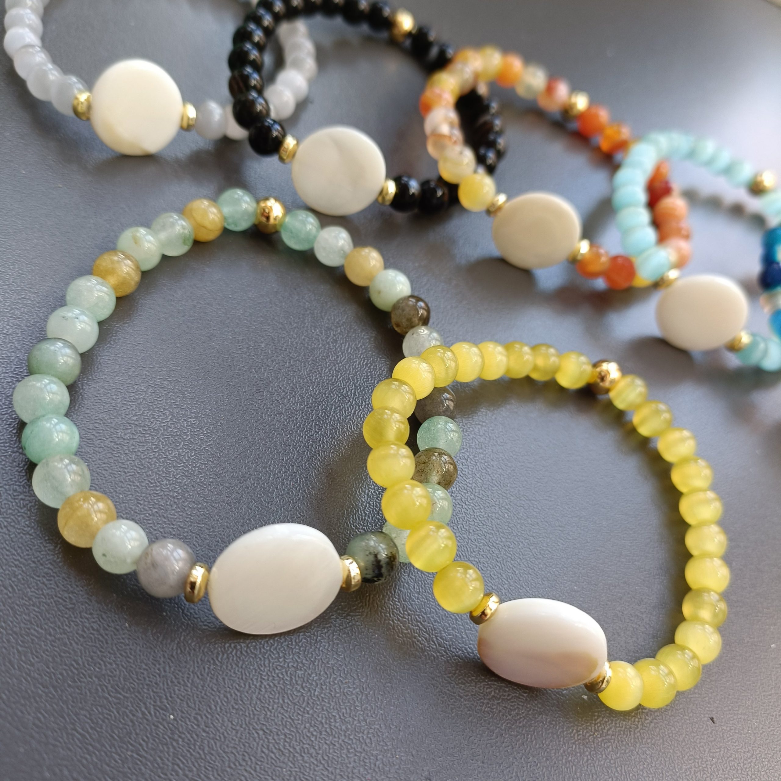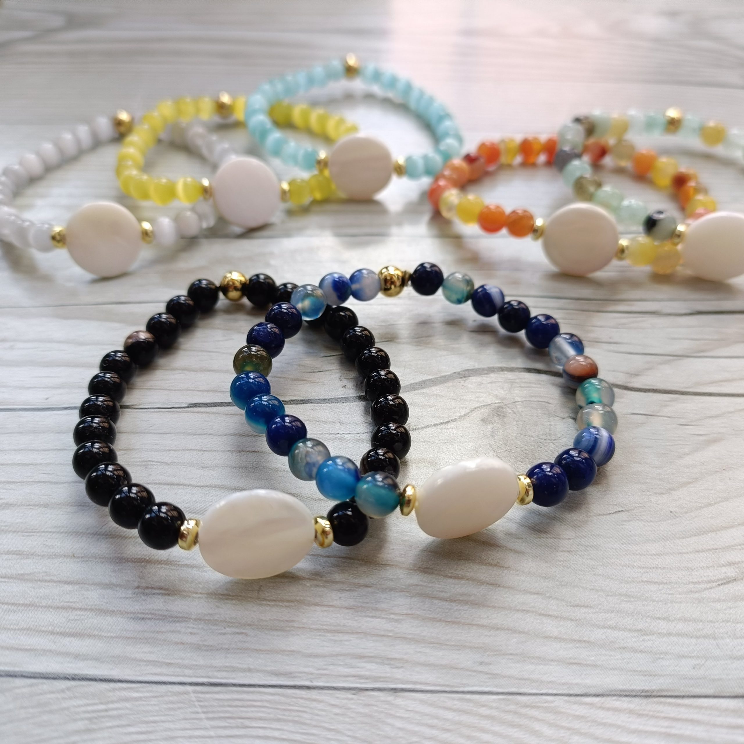 pulseras de ágatas y nácar. Con adornos dorados de hematite y acero.